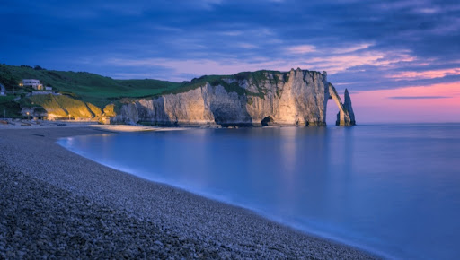 The picturesque seaside town of Étretat is located in the Normandy region of Northwestern France and is known for its chalk cliffs, including three natural arches, one of which is called L'Aiguille. Étretat is a popular place in Normandy.