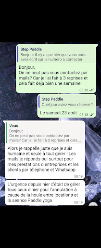 Premièrement, ils ont annulé deux fois nos rendez-vous au dernier moment (une fois le jour même et l'autre la veille). Ce que je peux comprendre car l'activité dépend de la météo. Ce que je condamne est le procédé. La premiere fois je leur ai demandé de me contacter via un autre numero pour les échanges. J'ai constaté que pour la deuxieme annulation cela n'a pas été respecté. J’ai toutes les preuves écrites de ces annulations ainsi que de mes demandes en avance ou vous me dites que les mails ne sont pas un reseau de communication. (Que je vais mette ci dessous) Déjà là on constate un gros probleme de gestion et d'organisation.
