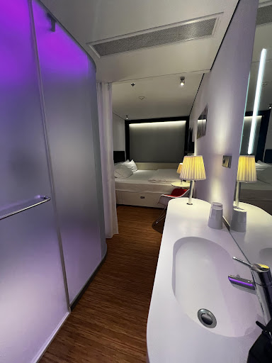 I LOVED everything about my guest room. The white color theme with the pops of red (tissue box, hairdryer bag, chairs) were relaxing and fun. The soft lights in the bathroom could be changed to any color you want using an ipad, which controlled nearly everything in the room as well. In general, the decor in general was modern and fun and the room was really comfortable. I honestly did not want to leave!!!