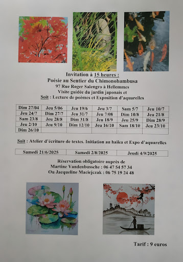 C’est un jardin à la minutieuse esthétique menant au pavillon de thé à travers bambous, arbres, fleurs, bouddhas, fontaines, bassin aux carpes koï, porte torii, cloches à vent, lanternes, chaines de pluie, pagodes, carillons, et même un gong ! Parcourir le jardin, c’est retrouver la liberté et le plaisir d’être, d’écouter, de regarder, de sentir, de toucher, de s’étonner, de s’émerveiller. Mettre tous ses sens en éveil et se laisser gagner par la sérénité. Différentes manifestations vous sont proposées. Par exemple : ateliers d'art floral et vous partirez avec votre bouquet, ateliers d'écriture de textes et découverte des haïkus, cette petite poésie japonaise décrivant l'instant présent, lecture de poésies se rapportant au jardin, exposition-vente d'aquarelles... Un calendrier est prévu jusqu'en octobre. Ici c'est VRAIMENT carpe Diem. Si vous voulez vous ressourcer et fuir l'agitation ambiante, vous ne serez pas déçus. Martine vous racontera son jardin qu'elle entretient dans les pures traditions japonaises, ce joyau que j'ai baptisé le jardin...