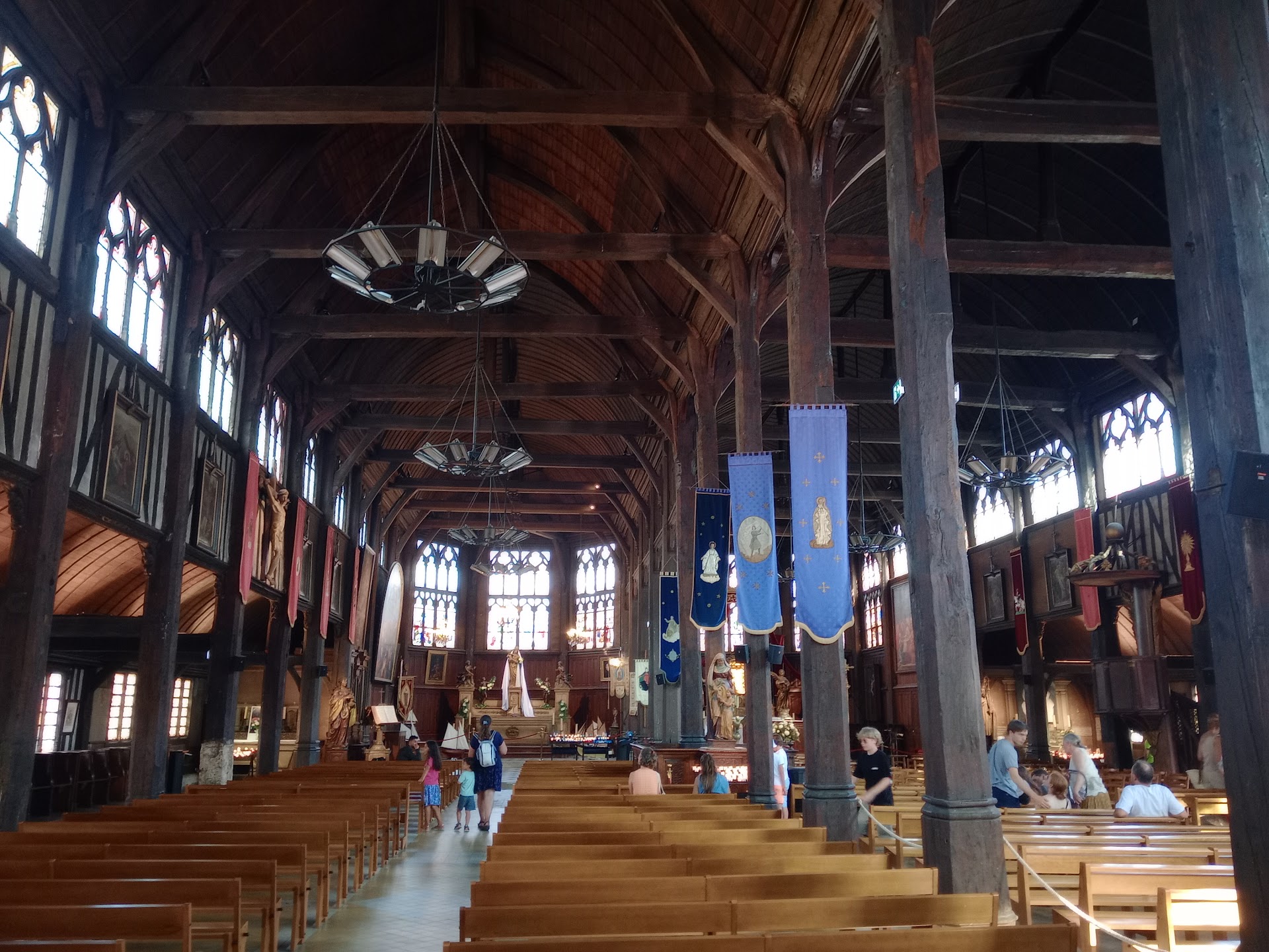 Read moreL' église est dédiée à sainte Catherine d'Alexandrie comme le rappelle une sculpture sur bois au-dessus du porche du clocher séparé des deux nefs. Elle y est représentée portant une roue et une épée. La première nef (celle de gauche) est la partie la plus ancienne de l'édifice, datant de la seconde moitié du XVème siècle, construite après la Guerre de Cent Ans. Elle a été bâtie sur le modèle d'une halle de marché, où ont été utilisés des éléments servant à la construction navale, le tout donnant l'aspect d'une coque de bateau renversée. Ensuite, a été érigé le clocher à bonne distance de la nef, pour éviter que les paroissiens présents dans l'édifice ne soient la proie des flammes en cas d'incendie. En effet, le clocher attire la foudre en raison de son élévation et de sa position à flanc de colline. Au XVIème siècle, on ajoute, à droite de la précédente, une seconde nef, dont la voûte est conforme aux voûtes en bois des églises gothiques modestes. Elle a donc une forme plus arrondie et une disposition de charpente, sans rapport avec la structure d'un navire. De plus, les deux nefs sont allongées de deux travées supplémentaires. Par ailleurs, elles sont encadrées par des bas-côtés de même longueur, également voûtés en bois. Les fameux « maîtres de hache » des chantiers navals de la ville ont réalisé ce bel ensemble sans avoir recours à la scie, tout comme leurs ancêtres normands que l'on voit en action sur la tapisserie de Bayeux et tout comme les Vikings avant eux. Les poutres utilisées pour la réalisation des piliers de la nef et des bas-côtés sont de longueurs inégales, car on ne disposait plus de troncs de chênes assez longs pour les construire. Aussi, certains ont une assise en pierre, plus ou moins haute et d'autres, aucune. Les travées du chœur, reprises au XIXème siècle, sont de qualité assez médiocre et le toit qui les couronne est surélevé par rapport à celui des parties anciennes. L'église est partiellement recouverte de bardeaux en bois de châtaignier, que l'on nomme dialectalement « essentes » et qui constituent donc un « essentage ». Le porche « néo-normand » a été construit sur le modèle de ceux des églises rurales de Normandie au début du XXème siècle et remplace un portail monumental en style néo-classique construit au siècle précédent et que l'on peut voir représenté sur certaines toiles de Jongkind ou de Boudin. Le portail sud quant à lui, est de style Renaissance. À noter l'orgue classique provenant de la paroisse Saint-Vincent de Rouen et le balcon Renaissance orné de personnages musiciens. Des vitraux du XIXème siècle décorent les fenêtres du chœur à l'est. L'édifice est classé au titre des monuments historiques en 1875. L'édifice est dénué de transept et les bas-côtés de chapelles qui sont uniquement matérialisées par des statues récentes de saints personnages dont les indigènes saint Marcouf et sainte Thérèse de Lisieux.