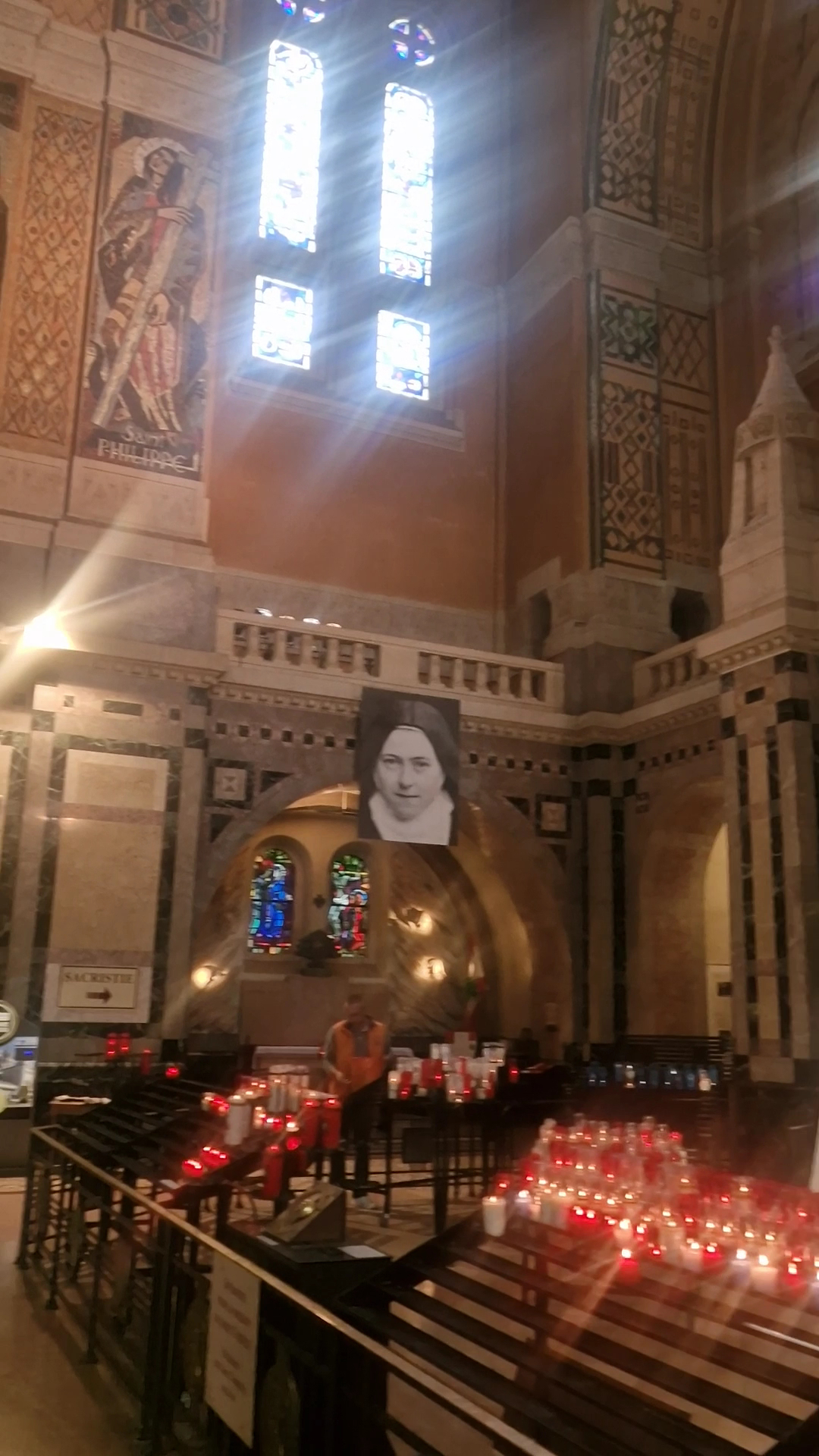Die steinernen Treppenstufen hallen unter meinen Schritten wider, während ich den Eingangsbereich betrete. Schon hier spüre ich die besondere Atmosphäre des Ortes. Eine stille Ehrfurcht, die in der Luft liegt. Durch die hohen, kunstvoll gestalteten Türen trete ich ein und werde sofort vom weiten Kirchenschiff empfangen. Der Innenraum ist wortwörtlich überwältigend. Weit über mir wölbt sich die gigantische Kuppel, verziert mit prachtvollen Mosaiken, die das Leben der heiligen Thérèse von Lisieux erzählen. Szenen aus ihrem kurzen, aber intensiven Leben entfalten sich in goldenen und bunten Farben. Ihre Kindheit, ihre Berufung zur Karmelitin, ihre einfachen, tiefgläubigen Worte, die die Herzen vieler berührt haben.