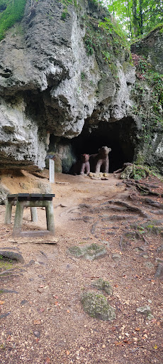 Source avec petite cascade. Et une surprise en arrivant sur le site... Attention à vous, des ours 🐻 vous accueilleront ! Mais rassurez-vous ils ne font pas de mal. Je me suis garée sur le parking à côté du cimetière. J'ai parcouru 800 m quasiment à plat. Endroit reposant, le calme est présent vous serez accompagné tout le long par le bruit du ruisseau qui coule et vous bercera ainsi que par une merveilleuse odeur d'arbres fraîchement coupés ! Une pancarte affiche l'existence d'une grotte à explorer mais je ne m'y suis pas aventuré...il y avait des ours...