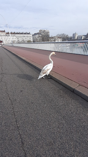 Rencontre insolite sur ce pont. Avec l'aide d'une mamie et d'un couple de jeunes, le cygne a été sauvé et rendu au fleuve ! Il s'en est allé tranquillement vers le sud ...