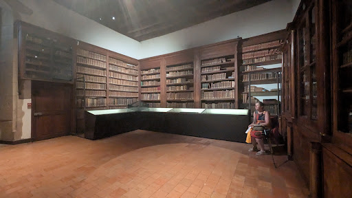 Le premier étage La salle de Bourbon : collection de tableaux Salle de la grande cheminée, armoiries de l'abbaye de Cluny et de Jean de Bourbon La salle de Lorraine Des œuvres illustrant quelques grands abbés sont exposées dans cette salle. L'armoire dressoir à armes de l'abbé Jean de Bourbon est remarquable car il s'agit du seul meuble d'origine du palais. La bibliothèque ancienne compte 4656 ouvrages répartis en deux fonds : Le premier est d'une importance exceptionnelle car il provient de la bibliothèque de l'abbaye saisie en 1789. Il comprend un ensemble de livres liturgiques dont un psautier et un missel de la fin du XVe siècle et le missel personnel de Claude de Guise daté de 1550. On trouve également les comptes-rendus des chapitres généraux de l'ordre de Cluny, des ouvrages de théologie, d'histoire ecclésiastique, de sciences, de géographie, des auteurs antiques et même l'Encyclopédie de Diderot et d'Alembert. Le second fonds, constitué à partir de plusieurs sources est beaucoup plus éclectique. Il est composé, entre autres, d'ouvrages de piété, de littérature classique et romantique des XVIIIe et XIXe siècles.