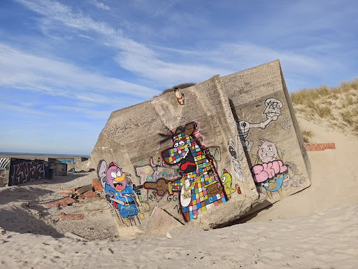Read moreMélange de l époque de la seconde guerre mondiale et peinture street arts, graffitis. Curiosité pour les amateurs. A observer pendant une ballade au bord de la plage, après dans le temps, ca se Mélange dans le décors, cela peut et surtout servir de point de repères...