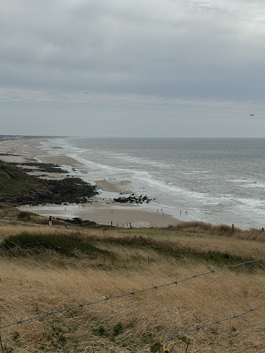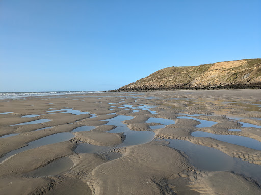 Read moreI'm glad I found this place, so close to our holiday appartment. There's free parking, meadows with cows and a stream of fresh water going down the cliffs next to the stairs that lead to the beach. With high tide, there's no sand beach and you can only walk around a small area with rocks, but with low tide, you can access the large sandy beach and walk south. Either way, it's gorgeous. Our kids loved it...