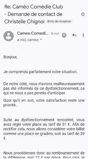 Il ne faut jamais avoir besoin du SAV, première et dernière fois. Organisation du spectacle du Caméo du rire avec un raté, cela arrive. 4 places prises en cat 1 les rangs n'ont pas été mis en place, faute de place dans la salle. On a été replacé plus loin et en cat 2 des places moins chère. Les gens sur place ont été adorables, nous n'étions pas les seuls cela concernait près d'une10aine de rangs et on a quand même passé un bon moment. On demande auprès de l'organisateur un geste commercial le jour même sur le site via le formulaire de contact. Il accepte très rapidement avec un bonus de 2 places pour aller voir un autre spectacle. Ouah c'est incroyable tout rentre dans l'ordre et le petit désagrément est oublié ? Il ne faut jamais parler trop vite. Depuis le 10 mai j'ai reçu le remboursement de la différence pour 2 places sur les 4 au bout d'un mois. J'ai donné tous les justificatifs qu'on m'a demandé et chaque fois un nouveau puis plus rien. Aujourd'hui 3 mois plus tard, n'ayez jamais besoin de quoi...