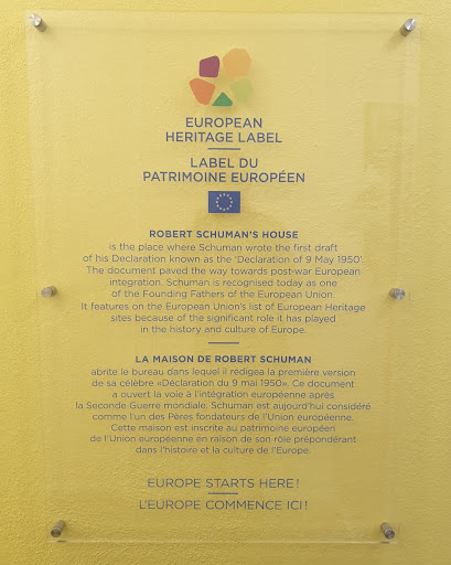 Monsieur Schuman est aujourd'hui considéré comme l'un des pères fondateurs de l'Union européenne. Cette maison est inscrite au patrimoine européen de l'Union européenne en raison de son rôle prépondérant dans l'histoire et la culture de l'Europe. En fait, l'Europe commence ici !