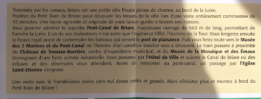 Read moreJ'ai passé une excellente journée à Briare, d'abord une balade degustatif sur le Canal de Briare qui est le Top. Puis, une superbe sortie en Petit Train de plus 45 minutes,au départ de l'embarcadère, vous sillonnez le Centre ville et longez les bords de la Loire, en pleine nature. Avec de très bons commentaires, du guide chauffeur, sa gentillesse et son humour...