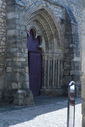 Aan de zuidelijke zijde van de kerk ziet men de restanten van de XIVe eeuwse versterkingen, die de stad beschermden. De toegangsdeur werd opgetrokken in vroeg gotische stijl. Ze bestaat uit een timpaan met vijf gemoluurde bloemslingers, pilaren die uitlopen op kapitelen 'à crochets' en een uit drie bogen bestaande rondboog.