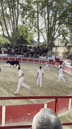 Read moreBelles petites arènes bien ombragées. On est à proximité des taureaux et des coureurs. En pleine fête de votive qui est une grande découverte pour nous c’était une jolie course camarguaise. Petit bémol le parking est pas en bon état il y a pleins de gros trous surtout à l’entrée… très poussiéreux par ceux qui ont des 4x4...