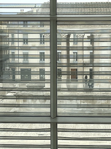 El pórtico con sus cinco esbeltas columnas metálicas que soportan un dosel de listones, también metálicos y, separados entre ellos, se apoya en un podio con cinco escalones que ayuda a otorgar monumentalidad al proyecto a la vez que busca encontrar equilibrio con el pórtico de arte imperial al que se enfrenta. Los dos accesos principales se ubican en los dos extremos de su planta rectangular. Diseñado en torno a una retícula de 9×9 con pilares cilíndricos de hormigón con una envoltura de fachada, de suelo a techo, realizada con diferentes tipos de vidrios y marcos de acero.