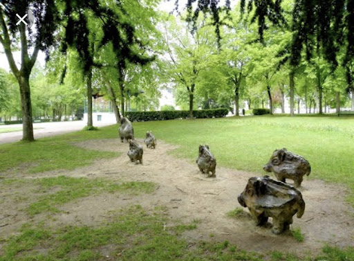 On y trouve une aire de jeux pour enfants, des bancs ombragés, une fontaine et des sculptures (un ours blanc en marbre de Michel Hannecart, des marcassins et ...