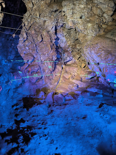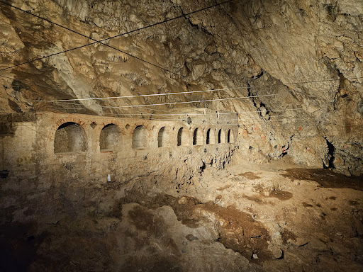 It's basically a ~20min movie projected onto the cave walls with narration and music. A dark, damp, cool cave, max 30m in, level, steel stairs, rails, like a scaffold, nothing scary at all. The sound-and-lights are done very well, images of people and animals projected on the stone (cave men eating something, explorers climbing in and finding the cave, wolves). Information too, if you listen closely which is hard, it's very distracting in there.