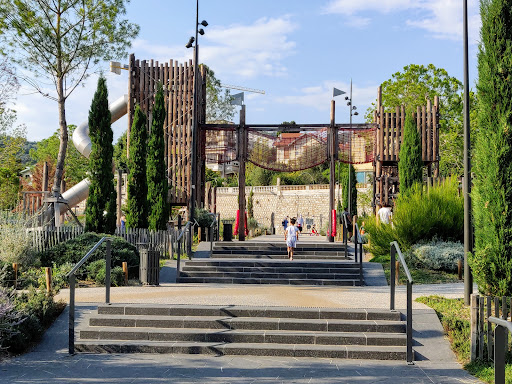 Read moreParco situato nella parte alta della città raggiungibile col tram 1, all'ingresso ci si imbatte in un ruscello artificiale dove i bambini giocano con i piedi a bagno. Seguendo l'acqua si arriva ad una cascata artificiale e una zona a destra con panchine e tavoli, sulla sinistra un grosso prato e altri tavoli sotto gli alberi. Salendo le scale si arriva ad un piano rialzato che conduce dopo un centinaio di metri all'attrazione principale, un grosso "castello" di legno con passaggi, ponti di corde, salite e un bellissimo e altissimo scivolo a spirale dove i bambini potrebbero passare l'intera giornata. Connesso al parco si trova un complesso residenziale particolare costituito da facciate in cemento, legno e vegetazione, probabilmente il parco Ú stato costruito come onere di urbanizzazione e...