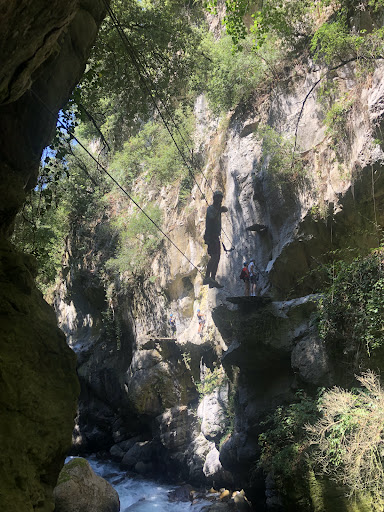 Read moreUne de ces via ferratas que j’affectionne particulièrement le long d’un ravin en passant d’un côté et de l’autre pendant que le torrent dévale sous nos pieds. La via eest très agréable à l’ombre et ça crescendo dm en difficulté avec plusieurs échappatoires si les bras ou les genoux le suivent plus. La première partie peut être faite avec les enfants a condition de bien s’accrocher car ça glisse un peu. La seconde a qqs passages en dévers sur l’horizontale mais ça va encore. C’est un peu plus difficile sur la 3e partie mais rien d’impossible. La dernière travée dure un petit moment avant une grande échelle verticale de barreaux pour atteindre soit un pong suspendu assez grand soir la tyrolienne mais attention c’est poulie jaune obligatoire la poulie grise classique PETZL est formellement déconseillée - je n’ai pas essayé. Bref très agréable en fin de journée faite en 1h30 ce 16/8/23 à partir de 18h30 la luminosité est encore bonne. C’est un cercle donc retour rapide au point de départ. Le canyon contourne le village très sympathique. Ça vaut le coup de venir et la ville indique bien et met en avant la via ferrata, bravo ! Je note D pour la longueur et 17/20...