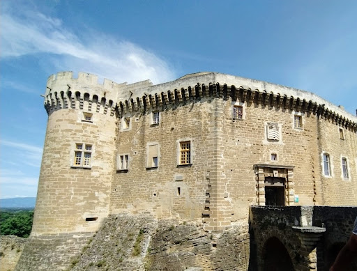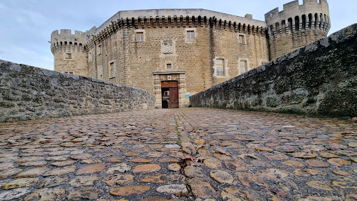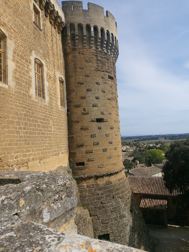 Un beau château aux allures de forteresse situé sur un promontoire rocheux. La totalité n'est pas visitable en raison de travaux, mais le prix du billet d'entrée a été réduit à 4€ (au lieu de 6€). Ce n'est pas cher du tout quand on constate la qualité du musée qui se trouve au 1er étage et dans une pièce au rez de chaussée, à visiter en autonomie grâce à un document remis à la caisse. Un guide (Stéphane pour notre groupe) passionné par son sujet accueille les visiteurs avant l'entrée dans la bâtisse puis jusque dans la cour intérieure et ne tarit pas d'explications et anecdotes des plus intéressantes. J'ai eu l'occasion d'entendre un second guide avec un autre groupe, il était tout aussi passionné. Bravo à eux de parler et de répondre aux questions avec autant d'enthousiasme tout en gardant leur masque malgré une chaleur étouffante. La visite s'achèvera en allant voir les vestiges d'une salle de jeu de paume. Rare et impressionnant également ! Un grand parking se situe en contrebas du château. Ce terrain herbeux peut accueillir les camping cars, les camions, et il y a même une borne de recharge pour les véhicules électriques. La montée à pieds jusqu'au château se fait à l'ombre des chênes verts, vous pourrez y apercevoir un fléchage vous guidant jusqu'à un...