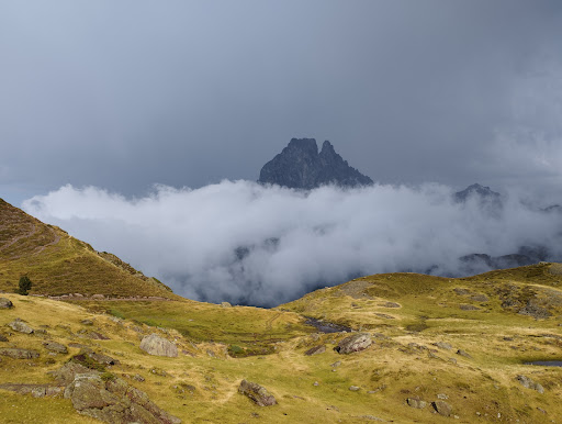 Panorama exceptionnel : depuis le Lac Gentau, on a une vue spectaculaire sur le Pic du Midi dâOssau, une montagne emblĂ©matique des PyrĂ©nĂ©es.