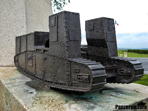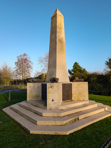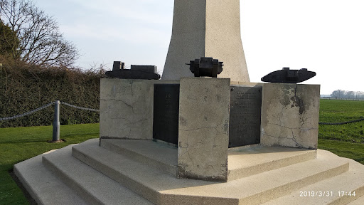 This place on the Somme battlefield was selected as the place for the memorial because it was near this location that tanks first went into action with the British Army as a new, surprise weapon against the German Army in the First World War. A few miles south of this memorial tanks were used at the Battle of Flers-Courcelette (15th - 22nd September 1916). An interesting feature of the memorial is the boundary “fence” around the obelisk. In the application to build the memorial the fence was suggested as a way of keeping cattle away from the plinth of the memorial. The boundary fence consists of ten upright 6 pounder tank gun barrels with tank driving chains mounted across them. Note: This memorial was hit by several 50 cal rounds from a plane in ww2....