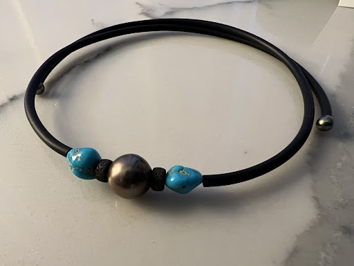 We came across the Laura Perles shop and immediately found what we were looking for! The most unique design with a his and a hers matching set! Black silicone band with two decent sized black pearls! We decided to find something for our 20 year old daughter and loved a suggested necklace (choker style) with the same black silicone material and a single black Pearl (bookended with a rough turquoise on each end). The attention to detail was exemplary because the ends of each side of the choker also had a unique setting.