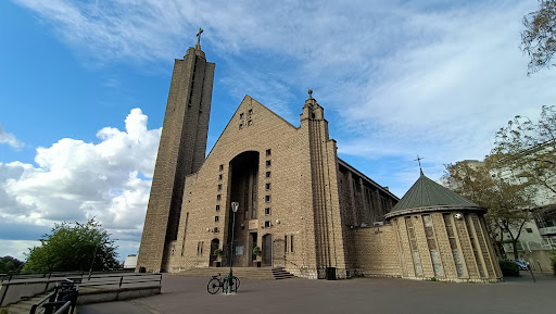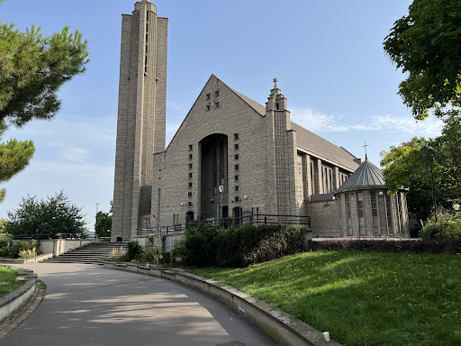 Église chrétienne votive pour remercier la Sainte Vierge d’avoir protégé Paris en 1944 . 2 églises rapprochées en mai 1952 et en 1954: une haute et une basse. Érigée à la suite d’un vœu en 1944 , et qui devait être remplacée par un plan urbaniste qui n’a jamais été fait. Donc fermeture de 1974 à 1988 . Rouverte avec l’inauguration de l’Hôpital Robert Debré . Après une occupation par la force en 1977 par l’église St Nicolas du Chardonnet. Clocher de 58 m de H ; murs en béton décorés d’une imitation de dallages en pierres . Sur le côté : petite chapelle ronde qui abrite le baptistère, comme aux temps anciens ou les baptêmes étaient donnés à l’extérieur ; et qui sert aussi de confessionnal. Très épurée. Elle est confiée à la communauté portugaise avec des messes en portugais régulièrement. Sur le côté, petit jardin face au parc de la Butte du Chapeau Rouge . Jardin en terrasses , bancs de...