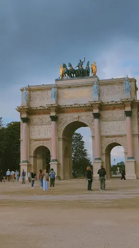 As we approached the arch, its elegant silhouette stood proudly in the open space of the Place du Carrousel, framed by the grand façade of the Louvre behind it. Built between 1806 and 1808 to commemorate Napoleon’s military victories, the Arc de Triomphe du Carrousel is a smaller, more refined sibling of its more famous counterpart on the Champs-Élysées. Its pink marble columns and bronze horses, replicas of the original ones taken from Saint Mark’s Basilica in Venice, stood out with delicate detail and historical charm.