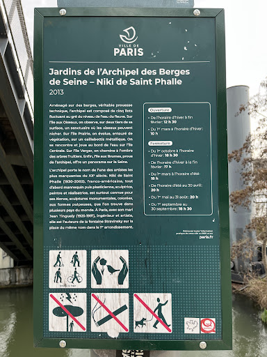 Read moreAménagé sur des barges, véritable prouesse technique, l'archipel est composé de cinq ilots fluctuant au gré du niveau de l'eau du fleuve. Sur l'île aux Oiseaux, on observe, sur deux tiers de sa surface, un sanctuaire ou les oiseaux peuvent nicher. Sur l'île Prairie, on évolue, entouré de végétation, sur un caillebottis métallique. On se rencontre et joue au bord de l'eau sur l'ile Centrale. Sur l'île Verger, on chemine à l'ombre des arbres fruitiers. Enfin, l'ile aux Brumes, proue de l'archipel, offre un panorama sur la Seine. L'archipel porte le nom de l'une des artistes les plus marquantes du XXe siècle. Niki de Saint Phalle (1930-2002), franco-américaine, tout d'abord mannequin puis plasticienne, sculptrice, peintre et réalisatrice, est surtout connue pour ses Nanas, sculptures monumentales, colorées, aux formes pulpeuses, que l'on trouve dans plusieurs pays du monde. À Paris, avec son mari Jean Tinguely (1925-1991), ingénieur et artiste, elle est l'auteure de la fontaine Stravinsky sur la place du même nom dans le 1e...