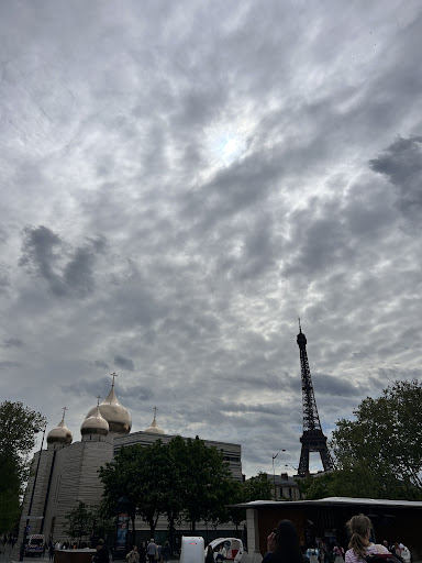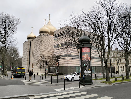 Sur le chemin du musée Branly, nous avons soudain vu un beau temple, que l'on aperçoit depuis le pont. Lorsque nous y sommes entrés, nous avons été surpris par sa propreté et sa beauté. Le temple a été conçu par l'architecte Jean-Michel Wilmotte. Le style est moderne mais avec des éléments traditionnels forts : des façades en pierre blanche, cinq dômes (le central et quatre plus petits aux angles) recouverts de titane doré. Les dômes brillent au soleil et soulignent le lien avec la tradition architecturale russe. L'iconostase est réalisée dans un style moderne, mais dans le respect des formes canoniques. Il y a beaucoup de pierres et de bois clairs, ce qui crée un sentiment d'espace et de paix. La cathédrale est devenue un symbole de la présence de l'Église orthodoxe russe en Europe occidentale et l'un des nouveaux points de repère architecturaux de Paris. La cathédrale fait partie d'un grand centre spirituel et culturel de l'Église orthodoxe russe, qui comprend également un centre culturel, des installations éducatives et des bâtiments administratifs.