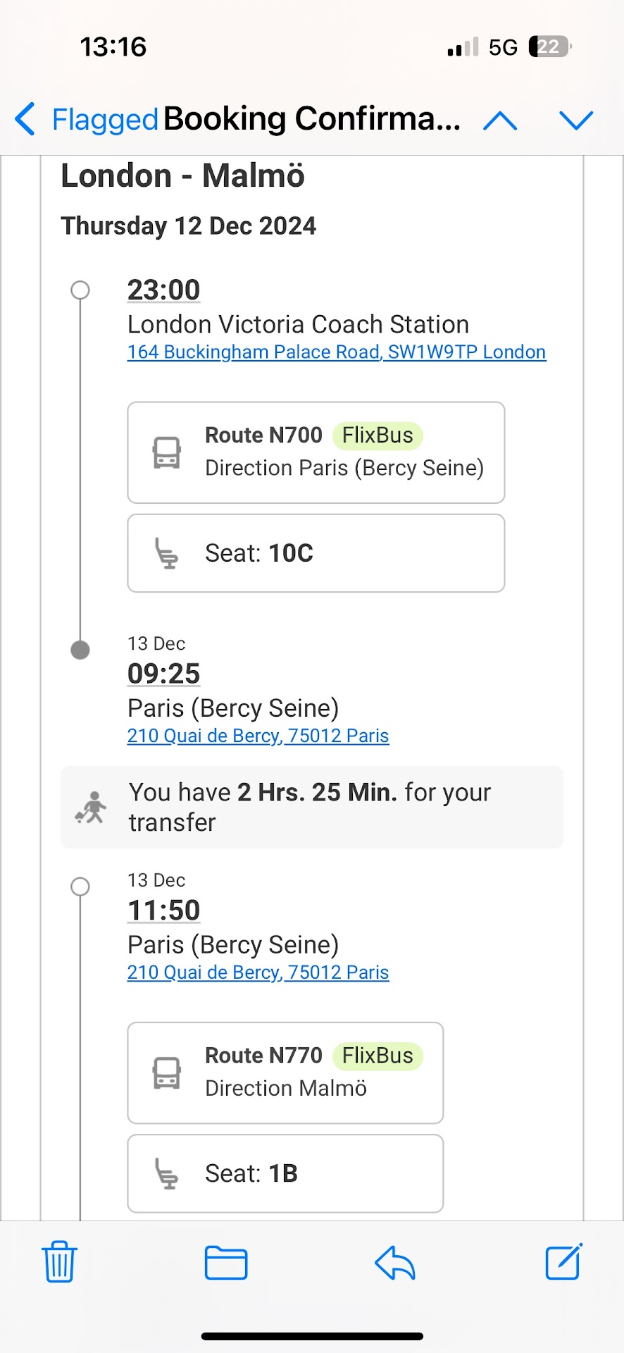 I was woman, alone and I was carrying two severely heavy suitcases full of my expensively made costumes I need for work, laptop and hard drives full of 15 years of composing work on it, wearing nice coat and high heels makes you very much stand out in that crowd. The other 3 travellers who also lost their Milan connection decided to book last minute flight and travel to airport. So we separated and I called friends to find more reasonable solution. While on the phone to them, my phone dies with no warning. Bercy Seine station does not have public phone and doesn’t have phone charging power points or any phone facilities!!!! However, my phone was fully charged, it died not for the battery reasons, it dies completely. My husband and friends no longer can get through to me. I was left with only one solution which is to cross Bercy park at 1 am, alone woman with my heavy suitcases. While having drug addicts locking their eyes on me since I arrived. I took the absolute short cut through the park which was through mud, seeing human bodies everywhere wrapped in sleeping begs on side of park near concert arena next to the park. By the time I arrived to more lit part of the street I was covered in mud. I cleaned my shoes and coat with wet wipes so I look decent before walking into the 5 star hotel reception… I really just needed their internet. Lucky my friends were onto it and I had taxi booked and waiting for me in 5 min. Serious neglect and life threatening experience thanks to flix bus I will report through out all media. No refund or response received from them ever. BE EXTREMELY CAREFUL WITH CHEAP TICKETS. YOUR LIFE OR DEAD BODY SHIPPED WILL COST MORE then 80 euros...