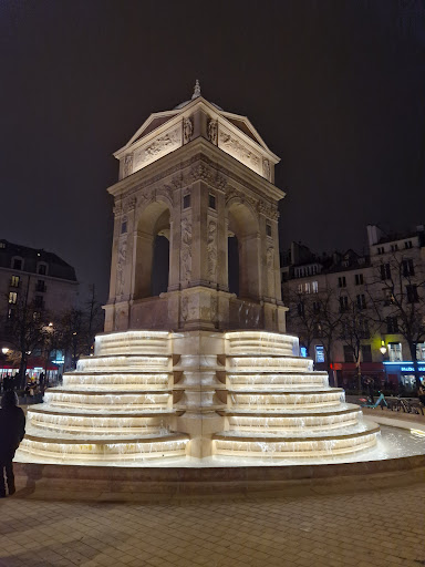 Such a beautiful work The fountain was commissioned as part of the decoration of the city to commemorate the solemn royal entry of King Henry II into Paris in 1549. Artists were commissioned to construct elaborate monuments, mostly temporary, along his route, from the Port Saint-Denis to the Palais de la Cité, passing by le Châtelet, the Pont Notre-Dame and the Cathedral. The fountain was placed on the site of an earlier fountain dating to the reign of Philip II of France, against the wall of the Saints Innocents Cemetery, at the corner of rue Saint Denis (where the King's procession passed) and rue aux Fers (today's rue Berger), with two facades on one street, one facade on the other. It was to serve as a fountain as well as a grand reviewing stand for local notables; it resembled the walls of a large residence, with water taps along the street at the street level, and a stairway to the loggia on the upper level, where officials stood on the balcony to greet the King. Its original name was the Fountain of the Nymphs.Once the procession had passed, the structure became a simple water fountain for the neighborhood, with taps, ornamented with lion heads, permanently trickling water. The upper floor of the fountain was eventually turned into a residence, with windows...