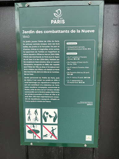 Read moreCe jardin n'est pas accessible au public, bien arboré, il est contigu à l'hotel de ville. Ce jardin jouxte l'Hôtel de Ville de Paris. Sa pelouse centrale évoque, avec ses buis taillés, les jardins à la française. De part et d'autres, chênes et magnolias, entre autres, lui apportent de l'ombre et magnifient la statue équestre d'Etienne Marcel (1302-1358), Prévôt des marchands de Paris sous le règne du roi Jean Il le Bon (1319-1364). Réalisée par les sculpteurs Jean-Antoine Idrac et Laurent Marquestre, inaugurée en 1888, elle rappelle que l'Hôtel de Ville se situe à l'emplacement de la «Maison aux Piliers» où résidait le Prévôt des marchands, alors à la tête de la municipalité de Paris. Jardin personnel du Préfet de Paris, puis du Maire, il est ouvert au public en 2015. Il rend hommage aux républicains espagnols qui ont contribué à la Libération de Paris. Cette neuvième compagnie, surnommée la Nueve, unité de choc de la 2ª Division blindée commandée par le Général Leclerc (1902-1947), est arrivée la première à l'Hôtel de Ville le 24 août 1944. Elle était majoritairement composée de républicains espagnols, réfugiés en France après la...