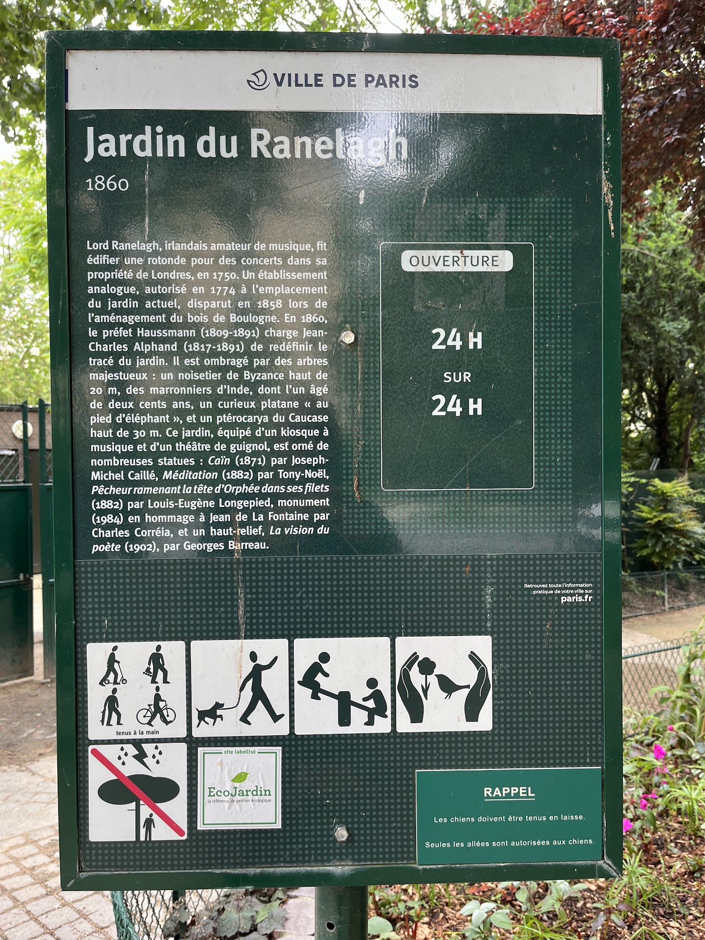Le jardin est découpé en plusieurs parties par des rues avec des passages de voitures. L'accès est très simple grâce au métro La Muette (ligne 9).