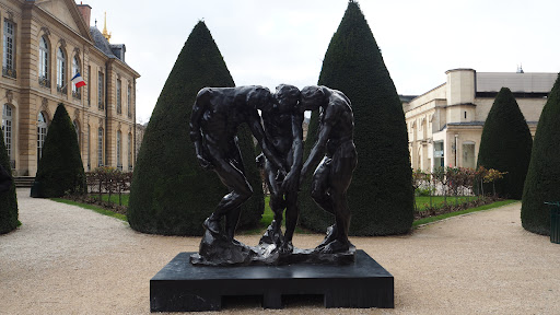 Les Trois Ombres est une sculpture emblématique d’Auguste Rodin, créée à la fin du XIXᵉ siècle dans le cadre de son grand projet La Porte de l’Enfer. Les trois figures identiques représentent des âmes condamnées, placées au sommet de la porte, pointant du doigt vers l’inscription "Vous qui entrez, abandonnez toute espérance", tirée de La Divine Comédie de Dante. Chaque "ombre" est une version du même corps masculin nu, tourné dans une direction différente, créant une impression de mouvement circulaire et d’enfermement. L’ensemble évoque à la fois la fatalité, la douleur et la perte de repères. Leur posture penchée et tendue ajoute à la tension dramatique de l’œuvre. Aujourd’hui, Les Trois Ombres peuvent être admirées dans les collections du Musée Rodin à Paris, où elles sont souvent exposées à part, permettant d’apprécier la puissance expressive de ce trio tragique. On retrouve également des moulages dans d'autres musées internationaux. Accessible facilement par métro (station Varenne), le musée Rodin est un lieu paisible et riche d’œuvres majeures. Les Trois Ombres y occupent une place centrale, symbolisant le génie de Rodin pour traduire les émotions humaines dans le marbre...