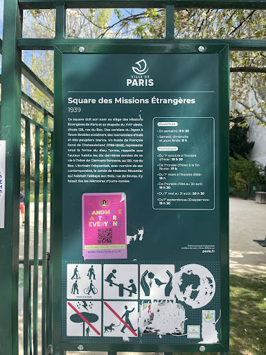 Joli square arboré, il dispose d'une aire de jeux pour enfants. Ce square doit son nom au siège des Missions Étrangères de Paris et sa chapelle du XVII® siècle, situés 128, rue du Bac. Des cerisiers du Japon à fleurs doubles avoisinent des marronniers d'Inde et des peupliers blancs. Un buste de François René de Chateaubriand (1768-1848), représenté sous la forme du dieu Terme, rappelle que l'auteur habita les dix dernières années de sa vie à l'hôtel de Clermont-Tonnerre, au 120, rue du Bac. L'écrivain fréquentait, avec nombre de ses contemporains, le cercle de Madame Récamier qui habitait l'abbaye aux Bois, rue de Sèvres. Il y faisait lire les Mémoires...