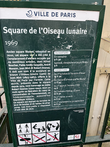Read moreSitué au 45-47 rue Blomet, Paris ( 15e ). Ouvert en 1969, à l’emplacement d’anciens ateliers d’artistes sous le nom de «Square Blomet ». Il porte le nom d'une sculpture de Joan Miro placée en ce lieu en 1974, qui avait son atelier au No 45 Rue Blomet. Renommé le 19 juin 2009 et prend pour nom « Square de l'Oiseau-Lunaire ». Une plaque explique l'histoire du lieu et la présence de la sculpture...