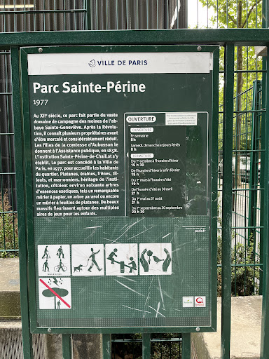 Public park nestled between buildings, sheltered away from the surrounding roads. Large sloping grassed area surrounded by trees and overlooked by the Sainte-Périne geriatric hospital. There are some small decorative gardens. The lawns are open for use including for ball games and picnicking. A gravelled amphitheatre is also popular for ball games. Children's play areas include a sandpit, climbing frames and riding toys for three separate age groups. The paved bike circuit is typically used by young cyclists, skaters and scooters. Dogs on leashes are allowed in certain areas and there is an informal off-leash dog play area. There are several picnic tables and fixed seating scattered around the park. Water fountains are available most of the year (as is the norm with most Parisian parks, water fountains are turned off during winter). Public toilets are outside the rue Mirabeau entrance. There is a park warden. A very popular destination for local families. Not recommended for jogging as to complete a circuit, you must pass through several small swinging gates. Venue for annual summer ball, as organised by the local council...