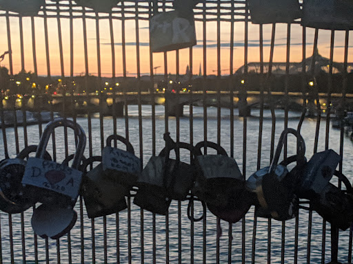 This is a Pedestrian bridge the passerelle Léopold-Sédar-Senghor and is sometimes mistaken for Pont des arts because loving couples now hang a lock on this bridge in a romantic gesture. Aspirant lockpickers, it is also an ideal place to train skills and help preserve the bridge😉