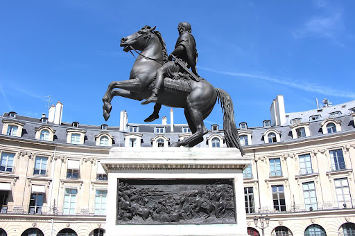 In der Mitte des kreisrunden Platzes steht die imposante Reiterstatue von Ludwig XIV., dem "Sonnenkönig". Sie thront majestĂ€tisch ĂŒber allem, und ich spĂŒre, wie der Platz von einer Aura vergangener königlicher Pracht durchdrungen ist. Die Statue wurde 1686 von dem Bildhauer François Girardon errichtet, um Ludwig XIV. und seine militĂ€rischen Siege zu ehren. Es war ein Moment des Triumphs fĂŒr den König, der die Macht und den Glanz des französischen Reiches ĂŒber ganz Europa ausstrahlen wollte.