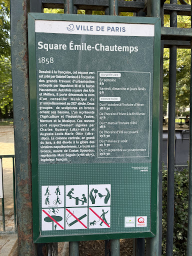 Read moreJoli square arboré avec 2 fontaines ⛲️, des espaces de jeux. Dessiné à la française, cet espace vert est créé par Gabriel Davioud à l'occasion des grands travaux d'urbanisation entrepris par Napoléon III et le baron Haussmann. Autrefois square des Arts et Métiers, il porte désormais le nom d'un conseiller municipal du 3° arróndissement au XIXe siècle. Deux groupes de sculptures en bronze orent ses bassins. L'un représente l'Agriculture et l'Industrie, l'autre, Mercure et la Musique. Ces œuvres sont respectivement signées par Charles Gumery (1827-1871) et Auguste-Louis-Marie Ottin (1811-1890). La colonne centrale, en granit du Jura, a été élevée à la gloire des victoires napoléoniennes. Le buste en bronze, œuvre de Costas Spourdos, représente Marc Seguin (1786-1875),...