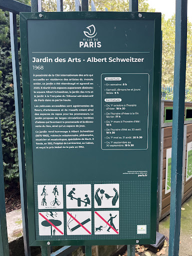 Il ne faut pas hésiter à monter les quelques marches qui permettent d'accéder à un très joli jardin, arboré et fleuri. À proximité de la Cité internationale des arts qui accueille en résidence des artistes du monde entier, ce jardin a été réaménagé et agrandi en Il réunit trois espaces auparavant distincts: le square Albert Schweitzer, le jardin des Arts et le jardin à la française du Tribunal administratif de Paris dans sa partie haute. Les pelouses accessibles sont agrémentées de fleurs, d'arbrisseaux et de massifs créant ainsi des espaces de repos pour les promeneurs. Le jardin propose de larges circulations bordées d'arbres qui favorisent la promenade et la découverte du lieu, ainsi qu'un espace de jeux. Ce jardin rend hommage à Albert Schweitzer (1875-1965), médecin missionnaire, philosophe, musicien et musicologue, spécialiste de Bach. II fonda, en 1913, l'hôpital de Lambaréné, au Gabon, et reçut le prix Nobel de la...