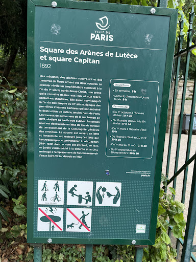 Read moreUn des espaces verts les plus atypique des Paris. Des arbustes, des plantes couvre-sol et des parterres de fleurs ornent ces deux squares. Le premier révèle un amphithéâtre construit à la fin du jer siècle après Jésus-Christ, une arène gallo-romaine dédiée aux jeux et aux représentations théâtrales. Elle aurait servi jusqu'à la fin du Bas Empire au Ill® siècle, époque des premières invasions barbares qui ont entraîné la destruction de Lutèce, ancien nom de Paris. Les travaux de percement de la rue Monge en 1869, révèlent sa partie sud oubliée. Sa section nord est découverte en 1883-85 lors de travaux de terrassement de la Compagnie générale des omnibus. Le square est ouvert en 1892 et l'ensemble est restauré jusqu'en 1918 par l'anthropologue et préhistorien Louis Capitan (1854-1929) dont le nom est attribué, en 1931, au jardin voisin dédié à la détente et au jeu, aménagé à l'emplacement de l'ancien réservoir d'eaux Saint-Victor...