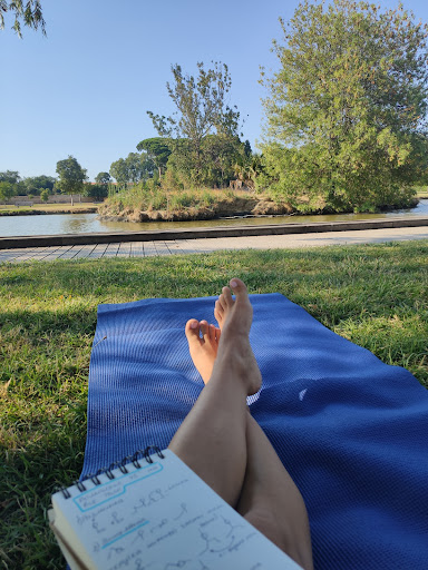 Хороший зелёный газон около озера. Можно комфортно заниматься йогой, фитнесом. Деревьев немного.