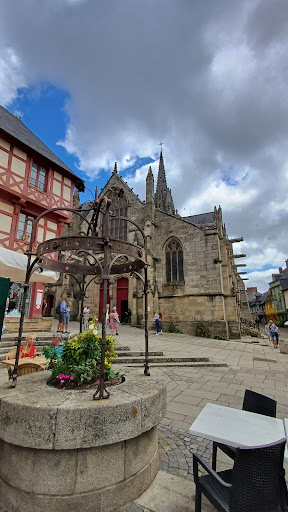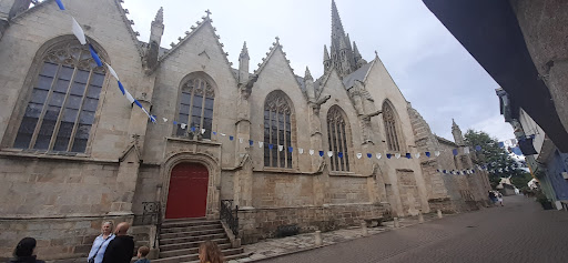 De gotische gevel en torenspits zijn indrukwekkend, en als je het aandurft om de smalle torentrap te beklimmen, wordt beloond met een spectaculair uitzicht over de stad en het kasteel van Josselin. Binnenin is de kerk versierd met prachtige glas-in-loodramen die, bij het juiste zonlicht, de ruimte vullen met een bijna magisch kleurenpalet.