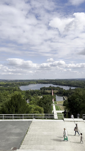 Places de parking sur la partie à gauche du site. Se placer en haut des marches au milieu des colonnes. En face paysage des étangs de Cergy. La passerelle remarquable avec ses arches rouges, permet de traverser l' Oise et rejoindre le tour des étangs. A l'horizon immeubles de La Défense et Paris. L' Axe Majeur est presque dans l'alignement des Champs Elysees. Se retourner et constater que la tour du Belvédère au milieu des bâtiments est légèrement inclinée (pour évoquer le presque alignement). Il est recommandé de descendre les marches pour profiter du parc. Au pied de la passerelle, amphithéâtre insolite au bord de l'eau. Lieux prisé pour les pique nique. Le parc peut être occasionnellement sali par les dèchets laissés par des mal élevés. Différentes aires de jeux pour les enfants (surveillance par un adulte indispensable). Vergers donnant des fruits (pommes, prunes) qui peuvent être cueillis en prenant soin de ne pas casser les branches. Attention aux baies non comestibles. On pourra chercher l'olivier- planté jadis par François Mitterand- qui a connu des jours meilleurs. Endroit difficile d'accès pour les engins à roue. Prévoir de remonter à la main les vélos et trotinettes des enfants. Site recommandé pour les photos...