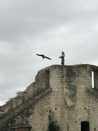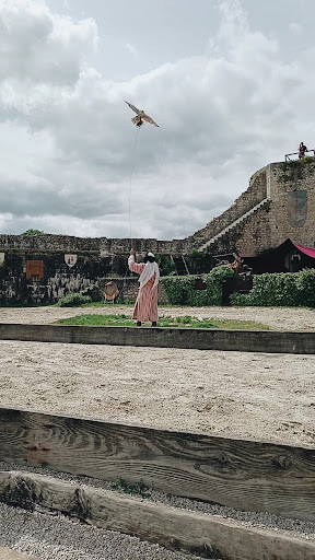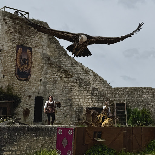 The arena is quite tiny, which is not handy for Telephotolenses. I'd recommend going there with a 100-400 mm lens max. There are no shadow spots, which makes it difficult to sit down there over an hour in the summer heat. Show hours on weekends are different on the main entrance than on the website, and the show starts at 2:30 pm. Doors open 30 minutes ahead of time. Also, hands should not be raised overhead, smartphones should be switched off, kids should be quiet (no talking), and it is forbidden to walk during the show. While it is mostly alright to have such requirements, these should all be indicated on the website. The show is quite interesting, and one learns about the falconry's historical facts. Some variety in birds of prey that are not seen elsewhere, such as grey South American eagles and Asian snake eating Bird, white tailed european, and US eagles as well. Show is presented in period suits and with horses. There are no high standing points for...