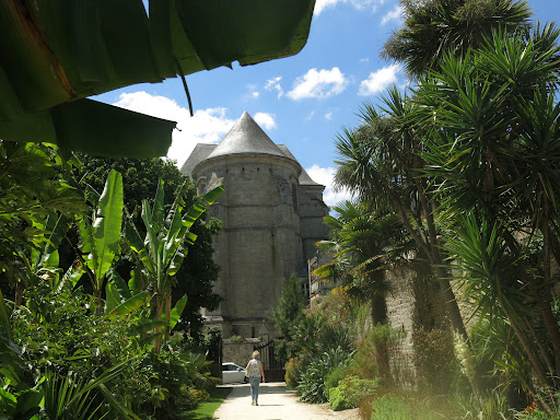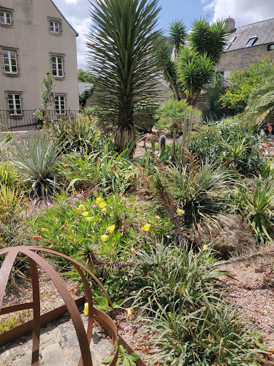 Sûrement un des plus beaux et les plus agréables Jardins de Quimper. Situer sur 3 niveaux une terrasse haute de style méditerranéen avec des vignes, des oliviers, des cyprès une pergola amenant une seconde terrasse dite de la paix. Vous remarquerez le pavement fais de mosaïque de galère représente une colombe portant un rameau d'olivier dans son bec. Vous trouverez également de table fait d'un billot de bois avec quelque chaises ainssi qu' une vue sur l'environnement quimperois ( chapelle des Jésuites cathédrale centre historique rempart jardin du conservatoire et jardin exotique ). Le jardin exotique constitue le niveau bas il est composé de deux parties la première en partant des remparts accueillant en son centre une fontaine et quelques bancs ombragés, par une végétation exotique. Une seconde vers le centre-ville également ombragée par des massifs formant une elipse, propice à la déambulation et à la méditation. Le matin ce lieu est agréable pour les lumières et la rosée qui orne les arbustes. Au zénith vous bénéficierez d'un ensoleillement et d'une chaleur qui détonne de l'environnement Finistérien. En fin d'après-midi et le soir vous aurez sous les yeux un tableau lumineux changeant à chaque instant et les caresses les derniers rayons de soleil...
