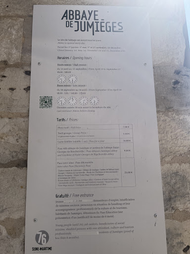 Read moreOn a little sign (and noted on the back of the free visit pamphlet) we found the link to the Jumieges 3D app and it really made our visit (available in English, French, German, Italian). The free basic pamphlet is available in French, English, German, Spanish, Italian, and Dutch. There is a free audio guide on the app and a function where you can view a recreation of what you would be looking at in the past. Note that guided tours are exclusively in French. You can choose to pay €5 for an audio guide tablet available in French, English, German, and Italian. There are lots of areas to sit down and the trees provide good shade on hot days. The exposition in the Logis Abatial at the back of the property featured artists predominantly from Tunisia and it was worth a (free) visit as well! We visited from Rouen by bus for a day trip and a few hours was all we needed. You can buy bus tickets to get back to Rouen at the Tourism Office because you cannot pay by card and the app...