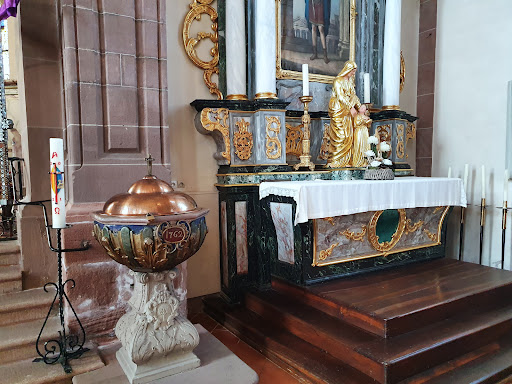 Read moreTrès belle église du style baroque. Cuve baptismale (1762) richement décorée de feuilles d'acanthe en grès doré. Sur le socle, un châtaigner, blason de la localité. Orgues (1765) de Jean - André Silbermann. Grand lustre de style Pompadour. Nativité et Adoration des Mages (XVI) Chaire baroque avec les quatre évangélistes et leur symbole. A...