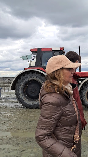 The tractor takes you to the low tide area in the middle of the sea and you get down without shoes in muddy waters. Part of the fun. (In summer) else you get boots.